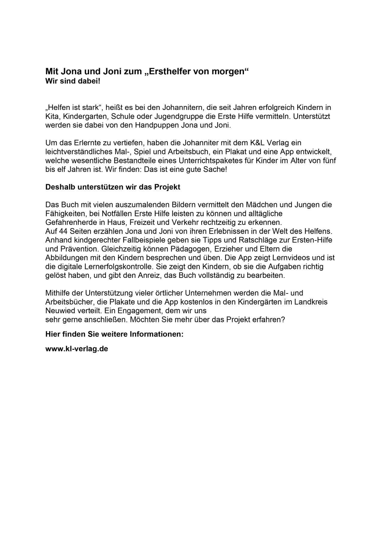 Wir unterstützen das Projekt „Ersthelfer von morgen“ der Johanniter-Unfall-Hilfe e.V., das Kindern im Alter von fünf bis elf Jahren spielerisch und kindgerecht die Grundlagen der Ersten Hilfe vermittelt. Mithilfe der Handpuppen Jona und Joni lernen die Kinder, wie sie in Notfällen richtig reagieren und Gefahren frühzeitig erkennen können.
